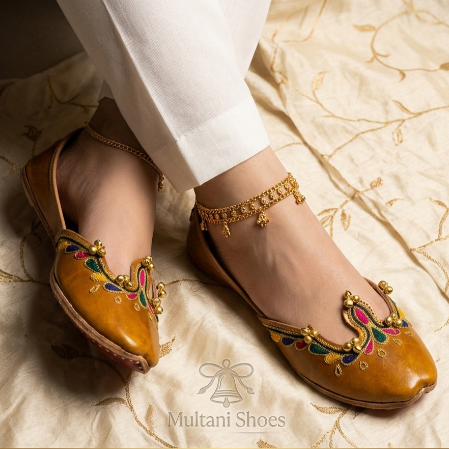 Step into a world of tradition and elegance with these stunning leather Kashmiri khussas, presented by Multani Shoes. Crafted with meticulous attention to detail Having littles golden 🔔🔔🔔bells , these khussas are a true testament to artisanal craftsmanship.